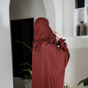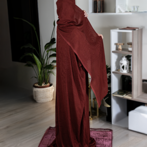 مصنوع من قماش ناعم ومريح يساعد على سهولة الحركة أثناء الصلاة، مع قصة واسعة توفّر تغطية كاملة للجسم.